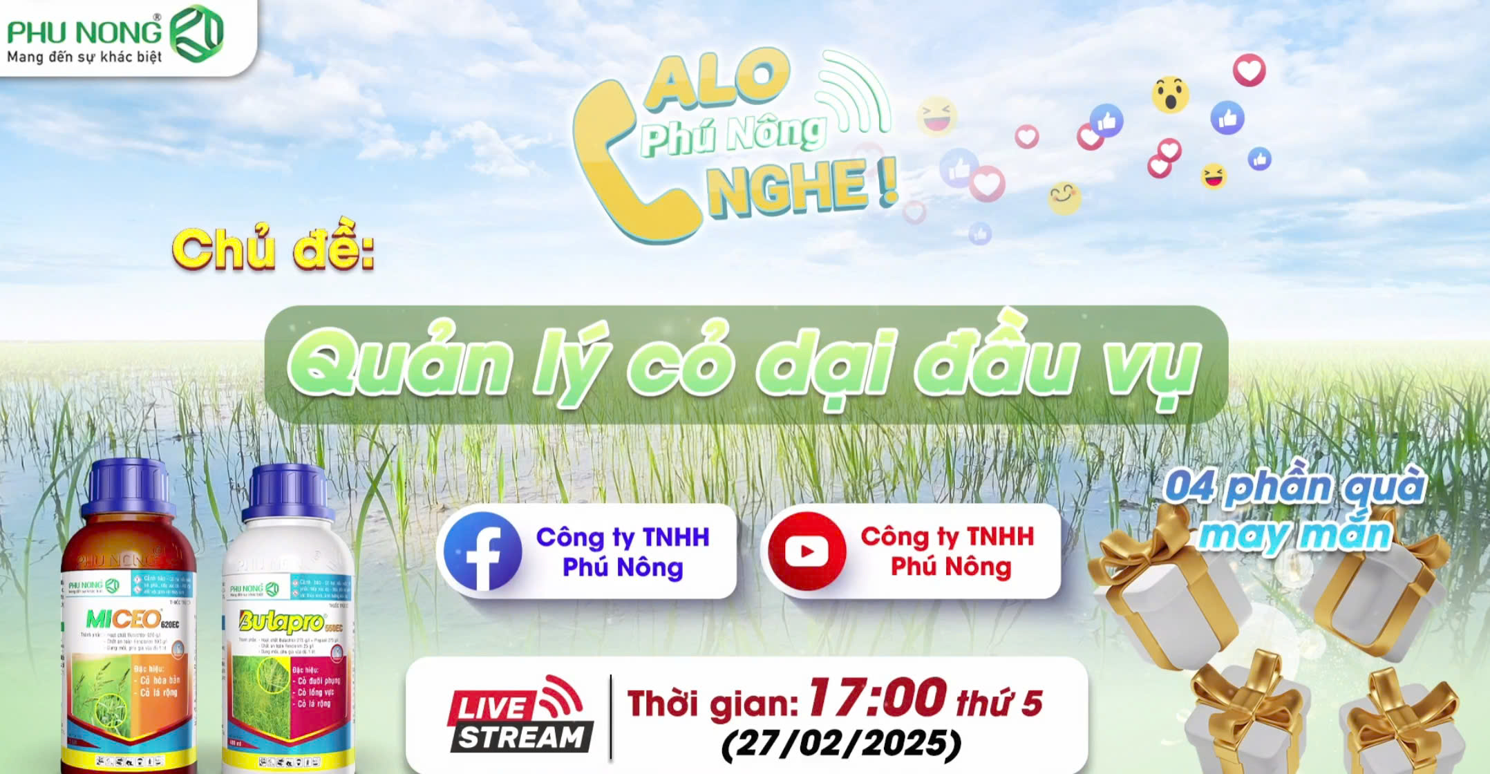 Alo Phú Nông Nghe (Kỳ 19) Chủ đề: Quản lý cỏ dại đầu vụ hè thu. Chương trình “Alo Phú Nông Nghe” được livestream trực tiếp lúc 17h thứ năm cách tuần trên Trang Fanpage và Kênh Youtube Công Ty TNHH Phú Nông. Đường dây nóng miễn phí: 18001163