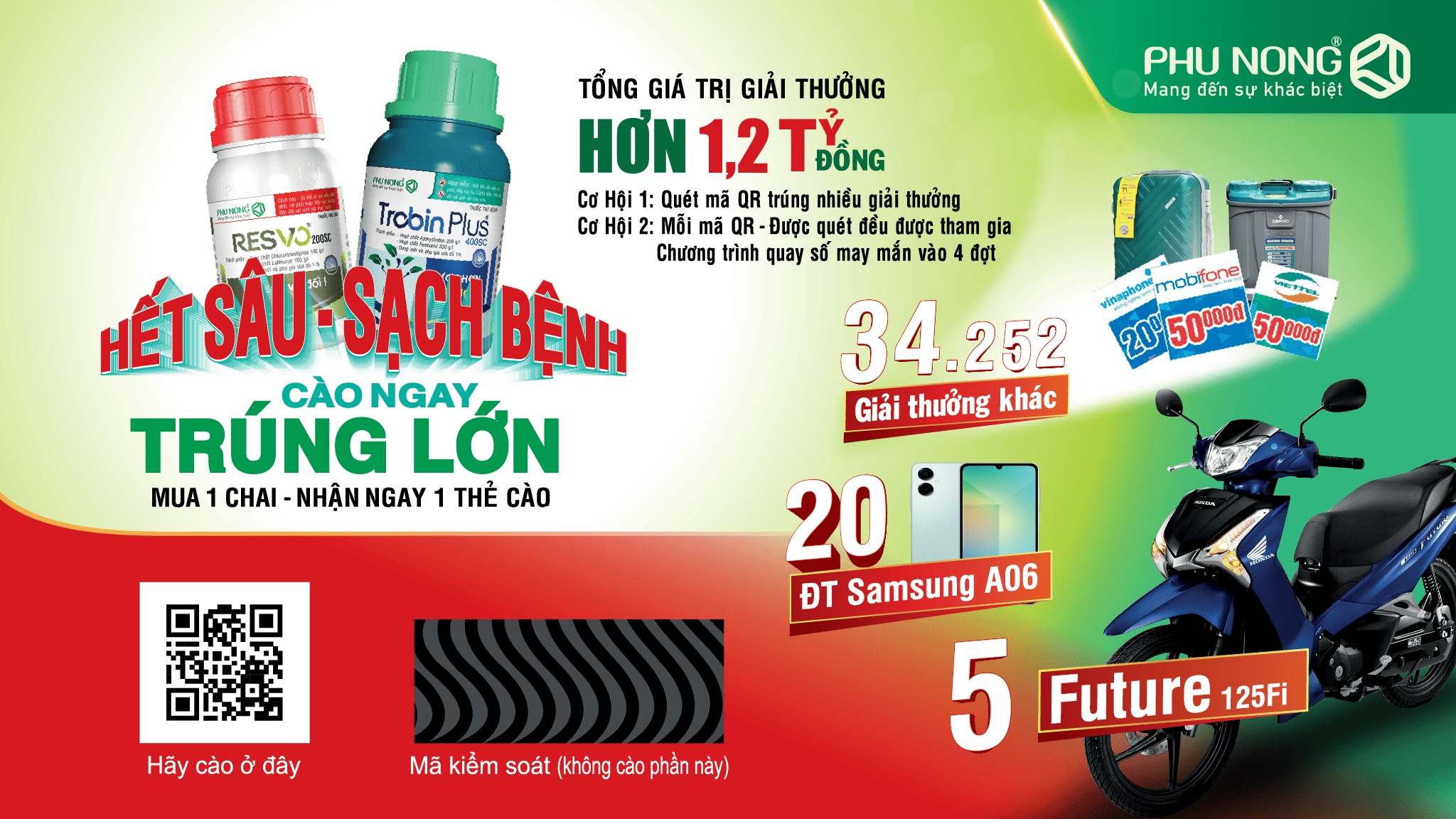 Nhằm tri ân sự tin tưởng và đồng hành của bà con trong suốt thời gian qua, Công ty TNHH Phú Nông chính thức khởi động chương trình khuyến mãi siêu hấp dẫn “Hết sâu sạch bệnh – Cào ngay trúng lớn” với 34.277 giải thưởng giá trị Trong đó có 05 chiếc xe Honda Future đang chờ chủ nhân may mắn!