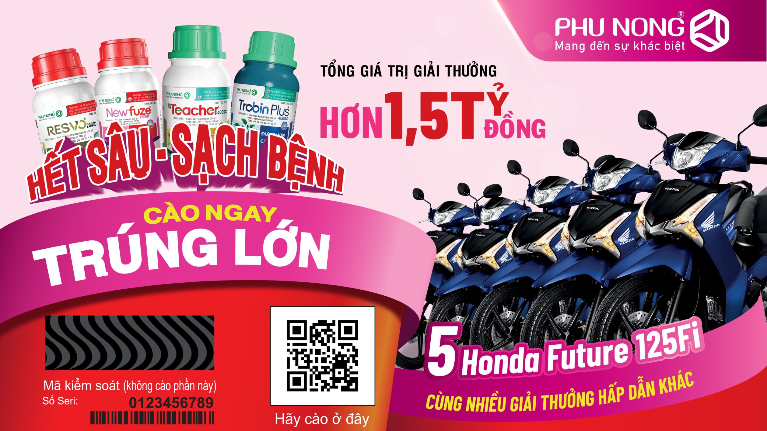 Với các giải thưởng là hiện vật bao gồm: (Thùng sản phẩm phân bón lá Biona Organic, phân bón PHU NONG Kali Phos và Xe Honda Future 125 Fi) bà con vui lòng giữ lại thẻ cào để đối chiếu khi nhận thưởng.