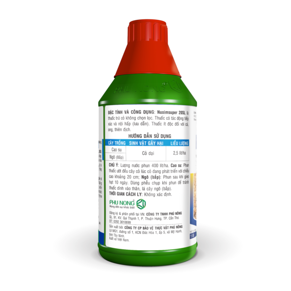 Nuximsuper 20SL là thuốc trừ cỏ không chọn lọc. Thuốc có tác động tiếp xúc và nội hấp (lưu dẫn). Thuốc ít độc đối với cá, ong, thiên địch.
