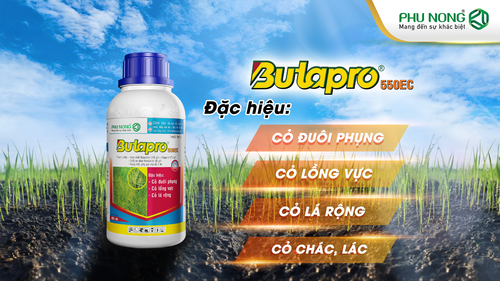 Thời điểm khoảng 7 – 11 NSS (cỏ 2 – 4 lá) để quản lý cỏ đuôi phụng, cỏ lồng vực, cỏ lá rộng – ruộng sạch cỏ khi phun: Butapro 550EC – Không lo vàng lúa.