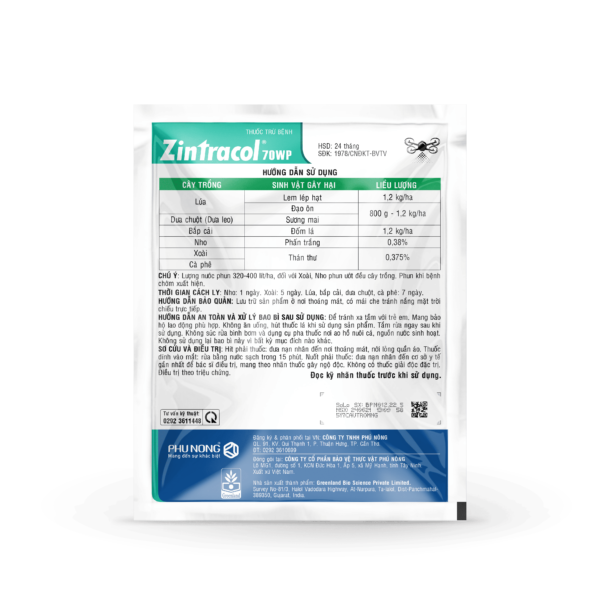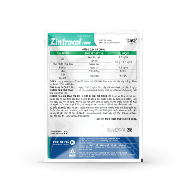 Zintracol 70WP là thuốc trừ nấm bệnh phổ rộng, có tác động tiếp xúc mạnh. Thuốc dùng phòng trừ các bệnh do nấm hại cây trồng.