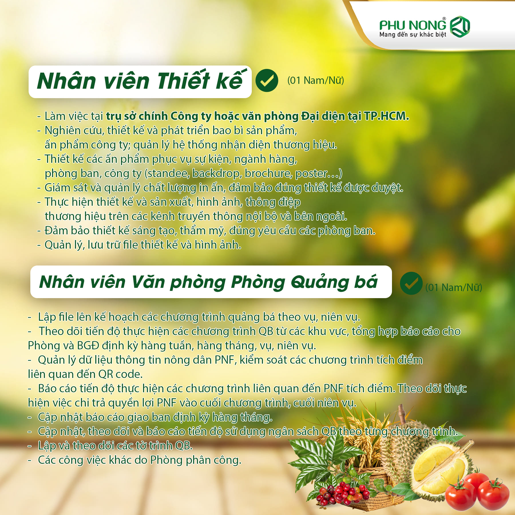 Mô tả công việc: Lập file lên kế hoạch các chương trình quảng bá theo vụ, niên vụ. Theo dõi tiến độ thực hiện các chương trình QB từ các khu vực, tổng hợp báo cáo cho Phòng và BGĐ định kỳ hàng tuần, hàng tháng, vụ, niên vụ. Quản lý dữ liệu thông tin nông dân PNF, kiểm soát các chương trình tích điểm liên quan đến QR code. Cập nhật, điều chỉnh thông tin PNF. Báo cáo tiến độ thực hiện các chương trình liên quan đến PNF tích điểm. Theo dõi thực hiện việc chi trả quyền lợi PNF vào cuối chương trình, cuối niên vụ. Cập nhật báo cáo giao ban định kỳ hàng tháng. Cập nhật, theo dõi và báo cáo tiến độ sử dụng ngân sách QB theo từng chương trình. Lập và theo dõi các tờ trình QB. Các công việc khác do Phòng Phân công.